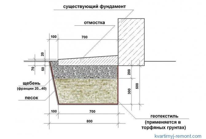 Подготовка уровня качества осуществляется в несколько этапов. Сначала удаляется растительный слой. Глубина удаляемого грунта зависит от ширины карниза дома.