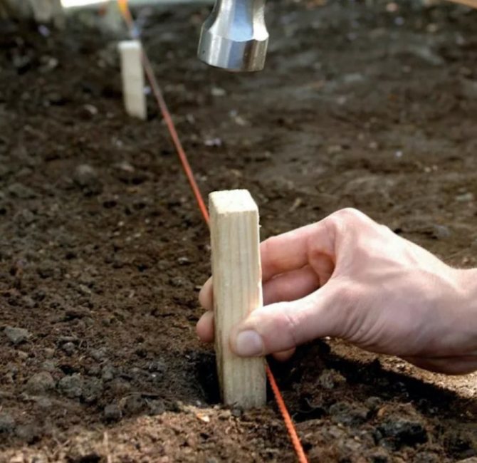 - Установить по периметру (снаружи от шнура) деревянные колышки с интервалом 1,5–2 м.