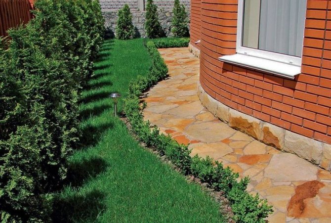 Его устанавливают для красоты, поэтому о требованиях речи не идет – эта часть работы отдается на откуп хозяина дома. Исключение – наличие вблизи дома (менее 5 м) кустарников (ежевика, малина) или деревьев (тополь, дуб, ясень, платан): бордюр защитит бетон от растущих «вширь» корней.