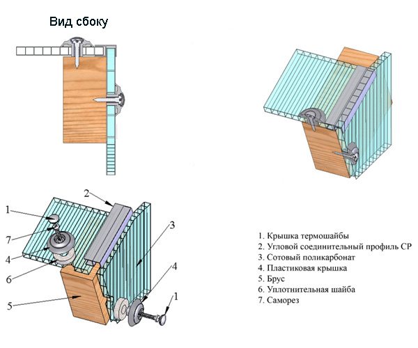 Крепление при помощи разъемных профилей осуществляется при помощи гвоздей к деревянной планке или каркасу. Если профиль крепится сразу на каркас, то крепление осуществляется саморезами с термошайбами с шагом в 30-50 см. В базу профиля укладываются заранее нарезанные панели поликарбоната, а сверху надевается крышка разъемного профиля, которая аккуратно пристукивается деревянной киянкой или резиновым молотком. Как и в случае с неразъемными профилями, пазы промазываются герметиком.