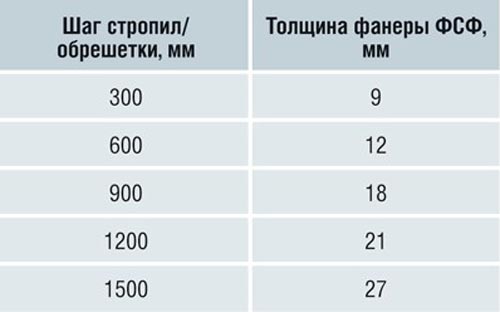 Таблица. Зависимость толщины фанеры от шага стропил