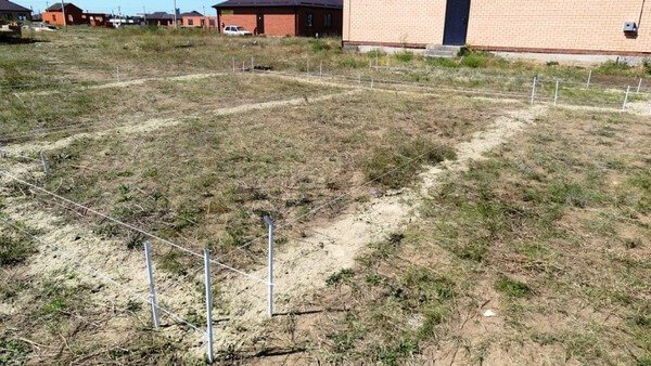 Первый этап — создание разметки на участке. Необходимо обозначить места, в которых будут устанавливаться винтовые опоры, тщательно выверив все расстояния и углы.