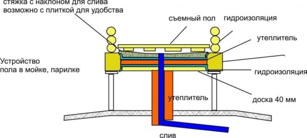 При устройстве фундамента для бани важно сделать слив. Поскольку баня будет установлена на винтовых сваях, то обычный слив с гидрозатвором не подойдет — зимой вода в нем будет замерзать