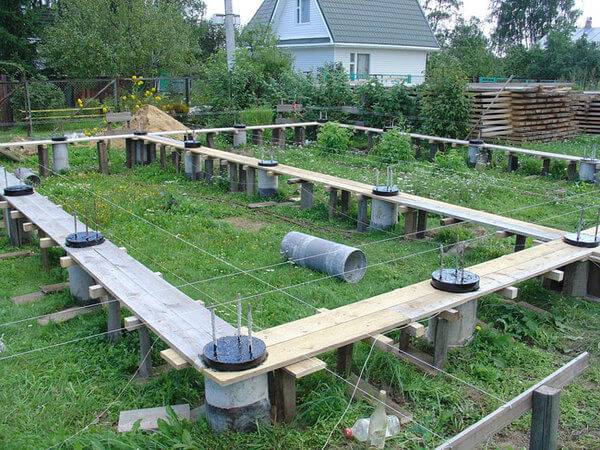 Прежде всего необходимо провести разметку площадки, определиться с количеством и расположением точек установки свай- в этих местах установить колышки