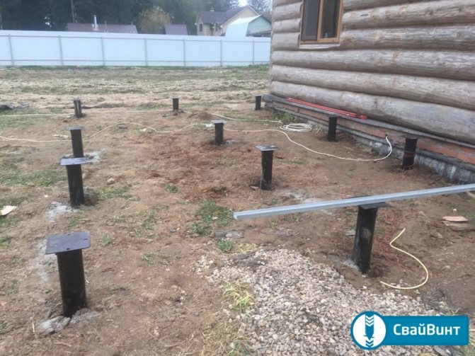 На начальном этапе винтовые сваи вкручивают в грунт. В местах, где они будут установлены, следует заранее сделать ямки глубиной 10-15 сантиметров.