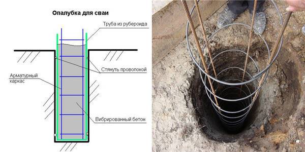 Можно устраивать опалубки из стальных, асбестоцементных или пластиковых труб, применять для этого конструкции с коробчатым сечением, но в таком случае цена устройства фундаментной основы увеличится примерно в двое, потому что кроме опалубки понадобятся сваи, сохраняющие несущую способность. Бетонный раствор заливают сразу в пробуренную в грунте скважину.