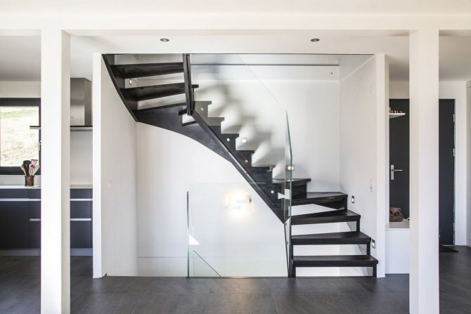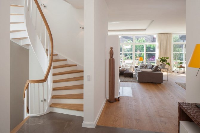 Если в доме свободного пространства мало, то большая монолитная лестница будет не уместна. Мало того, что она займет много места, вокруг неё еще нужно обыграть пространство. Для малогабаритной комнаты подойдет вариант у стены, забежная лестница с поворотом на 180 градусов или винтовая, размещённая в угловой части помещения.