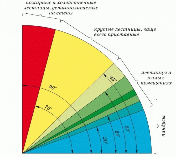 Оптимальным показателем угла наклона для комфортного пользования лестницей в жилых домах считаются параметры от 24 до 37. Если лестница имеет крутизну свыше 45, то спуск необходимо производить только спиной вперёд.
