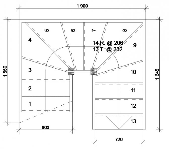 При расчете обратите внимание на оптимальное число поворотных ступеней. По моему опыту оптимально 3 ступени при ширине лестницы в 80 см