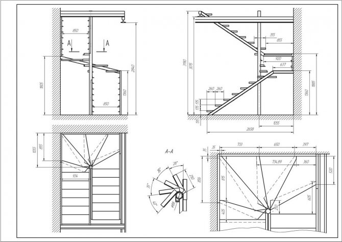 Перед тем как начать расчёты поворотной лестницы на 180 градусов, необходимо создать эскиз конструкции. Для маршевой лестницы на эскизе обязательно указывают размеры. На бумагу наносят не только параметры конструкции, но и самого помещения. Обязательно отмечают места расположения окон, дверей и прочего. Некоторые примеры чертежей можно увидеть на представленных ниже фото.