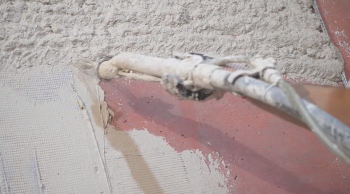 Если раствор будет наноситься на деревянную поверхность или утеплитель (минеральную вату), необходимо набить на стену дранку или армирующую сетку. Это позволит усилить сцепление раствора со стеной и повысит прочность покрытия. С этой же целью на гладкую бетонную поверхность наносят насечки при помощи дрели и отрезного круга.