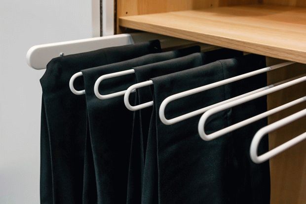 — Расстояние между штангой для одежды и верхней полкой должно быть не меньше четырех-пяти сантиметров, это позволит удобно снимать и вешать вешалки.