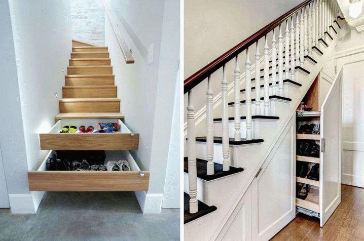 • Лестничные проемы – если вы живете в двухэтажном доме, используйте пространство под лестницей. Например, можно сделать выдвижные ящики под каждой ступенькой для хранения сезонной обуви. Это поможет сэкономить место и скрыть обувь от посторонних глаз. Также можно организовать небольшую гардеробную под лестницей, установив несколько полок для коробок с обувью.