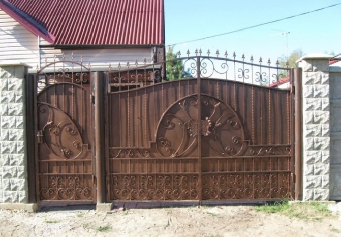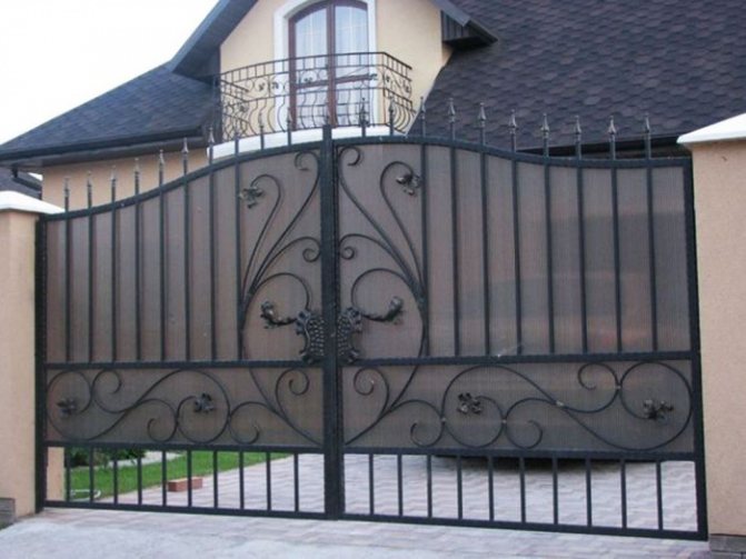 - Кованые створки с поликарбонатом. Подобные изделия являются легкими и при этом красивыми. Стоит помнить, что сделать их самостоятельно не получится. Выбирать такой вариант стоит в случае, когда на участке создается каменный или кирпичный дом. На прилагающихся фото можно увидеть красивые кованые ворота и понять, что именно подходит для вашего участка.