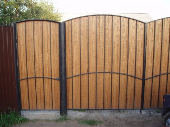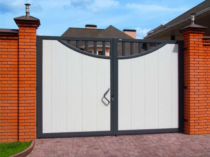 - Створки из пластиковых панелей. Данный материал закрепляется на металлическом основании. Создать описываемый тип конструкций можно собственными руками. При этом используемые материалы являются довольно дешевыми. Такой вариант выбирают многие владельцы участков, которые желают оформить ворота таким образом, чтобы они сочетались с оформлением дома.
