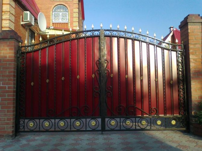 Часто на дачах устанавливаются металлические и деревянные ворота. Все более популярными становятся и комбинированные конструкции. Для изготовления металлических ворот применяются профильные трубы, арматура и уголки. Наиболее популярными являются конструкции из профнастила, так как они имеют следующие преимущества: